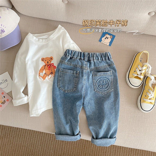 Spring autumn girls embossed smile jeans 1-6 years children fashion solid color all-match denim pants